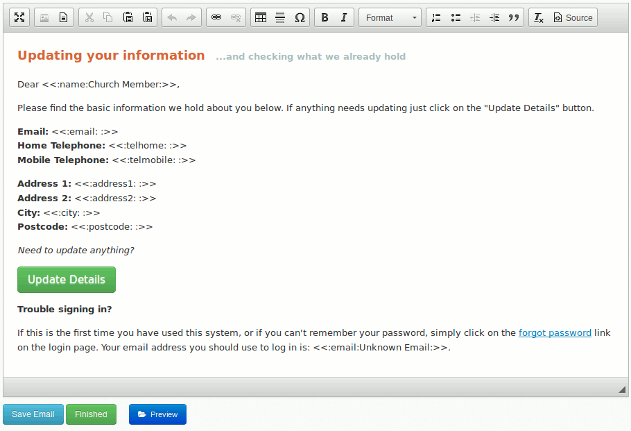 The tags in the template will be replaced with the member's details and they'll be able to follow the link to update their details in ChurchBox should they need to.